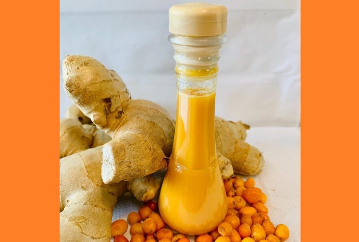 - Wash the sea buckthorn well and crush it in a blender along with the grated ginger.