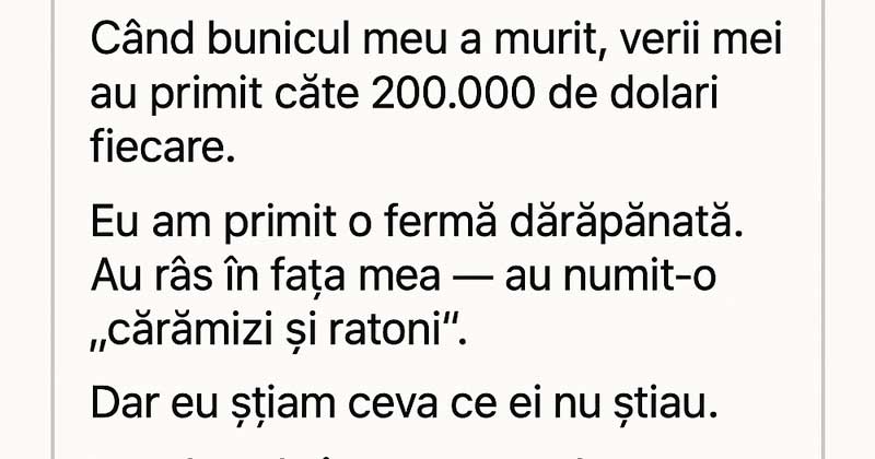 When the lawyer announced that I had been left the old country house, the entire room burst into laughter. “She got mold and memories,” a cousin joked.